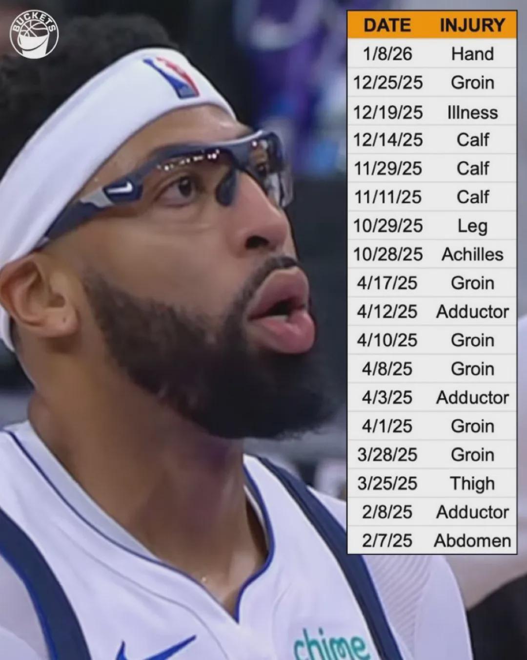 浓眉生涯至今一共打了807场常规赛,缺席了283场常规赛,总出勤率74%。作为对比,跟浓眉同届的哈里森-巴恩斯打了1036场常规赛,庄神打了939场。随着年龄的增长,浓眉越来越脆了,上赛季打了51场,本赛季至今只有20场。